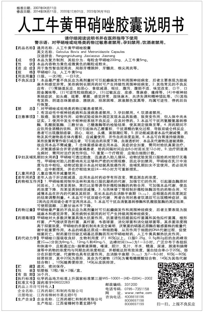 人工牛黃甲硝唑膠囊